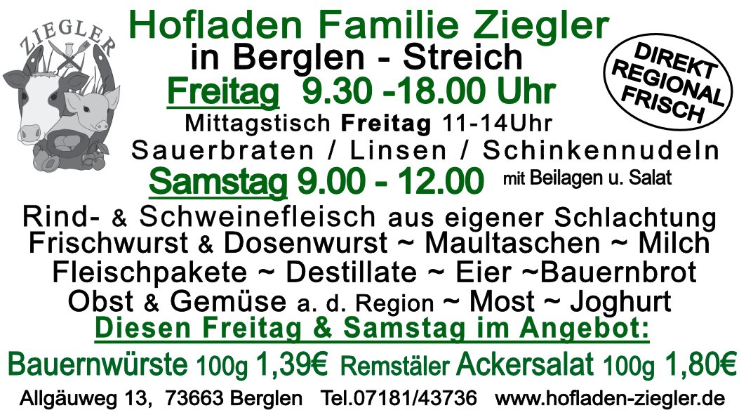 - Wöchentlich frisches Rind- und Schweinefleisch aus eigener Schlachtung