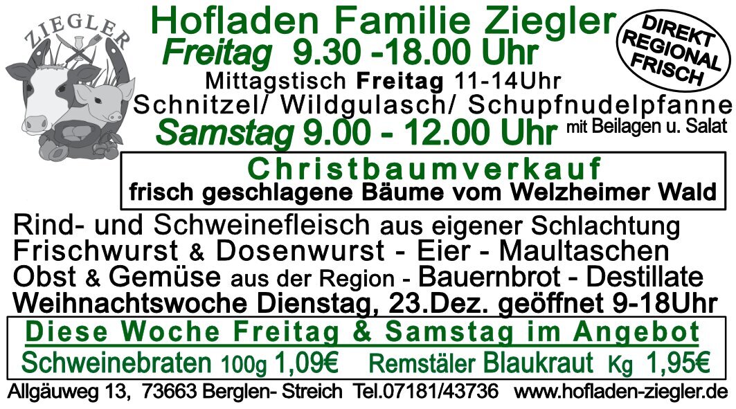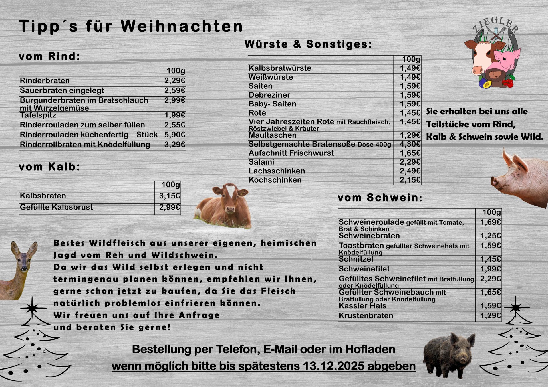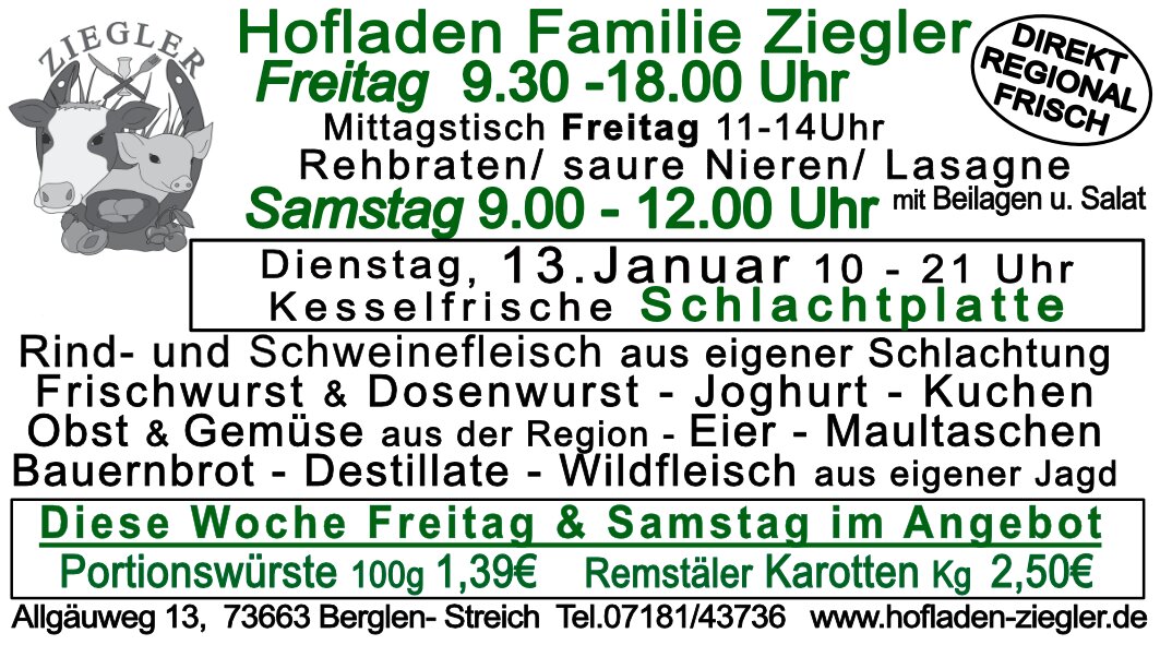 - Wöchentlich frisches Rind- und Schweinefleisch aus eigener Schlachtung